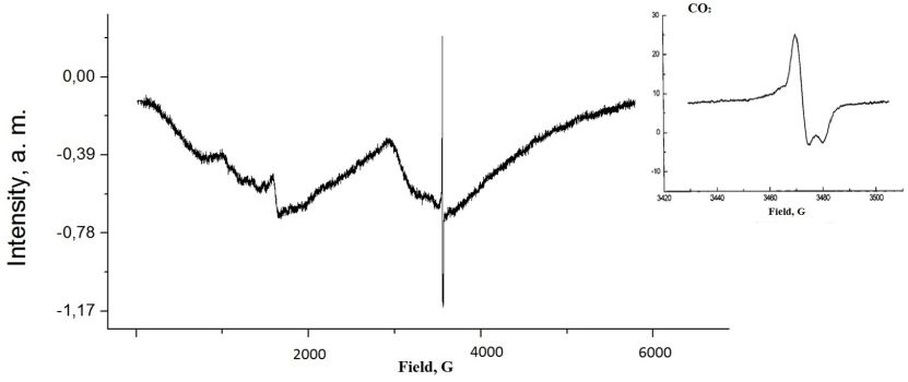 На спектре зарегистрирован сигнал от аксиально-симметричных парамагнитных центров CO2- с g‖ = 1.9975 ± 0.0005 и g┴ = 2.0032 ± 0.0005. Сигнал является радиоиндуцированным, т. е. ПЦ образовались под действием ионизирующего излучения (радиации).