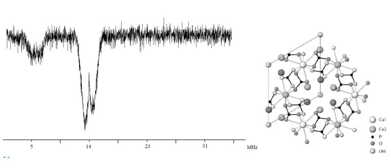 На рисунке приведен ENDOR спектр биологического гидроксиапатита (зубной эмали). Метод был использован для получения информации об окружении содержащихся в эмали парамагнитных центров CO2-. Зарегистрированы сигналы от ядерного окружения центра CO2- на частотах 14 MHz и 5.6 MHz. Сигнал на частоте 14 MHz относится к ядрам водорода, а сигнал на частоте 5.6 MHz – к ядрам фосфора. Исходя из структурной особенности биологического апатита, можно сделать вывод, что исследуемый парамагнитный центр CO2- находится в окружении анионов OH- и PO4-.