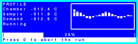 - 3. The profile will now run, displaying the percentage progress of the entire run at the bottom of the display and the real time temperatures on the left. The right-hand side of the display will show a graphical representation of the control accuracy. Except at rate changes, this should show a narrow band through the centre of the graph.