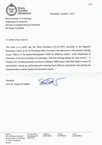 Елена Куренкова прошла обучение на курсах "Basics of the pulsed-field-gradient NMR for diffusion studies" в Королевском институте технологий в Стокгольме, Швеция, и получила сертификат. |